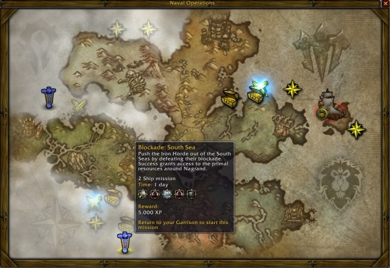 A Naval missionök egy új fület kapnak a Command Table-nél, ezen Draenor térképét és a fenyegetéseket láthatjuk. Először természetesen a bázisunk környékét kell megtisztítanunk, ezután hajózhatunk távolabbi vizekre. Nem minden küldetést csinálhatunk meg azonban rögtön, először meg kell törnünk az adott terület blokádját.