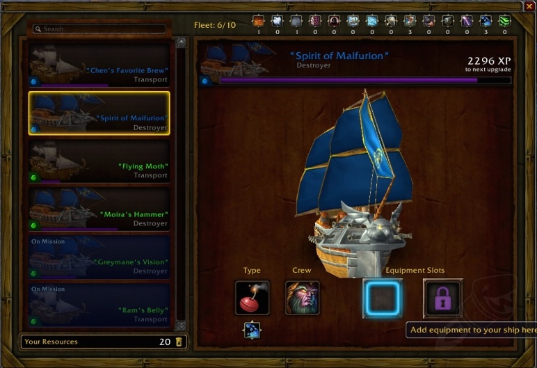 A képességet és a legénységet nem választhatjuk meg, de a felszerelést igen. Érdemes megfontoltan választani, mert a későbbiekben nem módosíthatunk rajtuk. A Blizzard elképzelése az, hogy a hajóinkat időről-időre pótolni kell, ezért nem rerollolunk, hanem új kombinációkat próbálunk ki egy másik hajón.