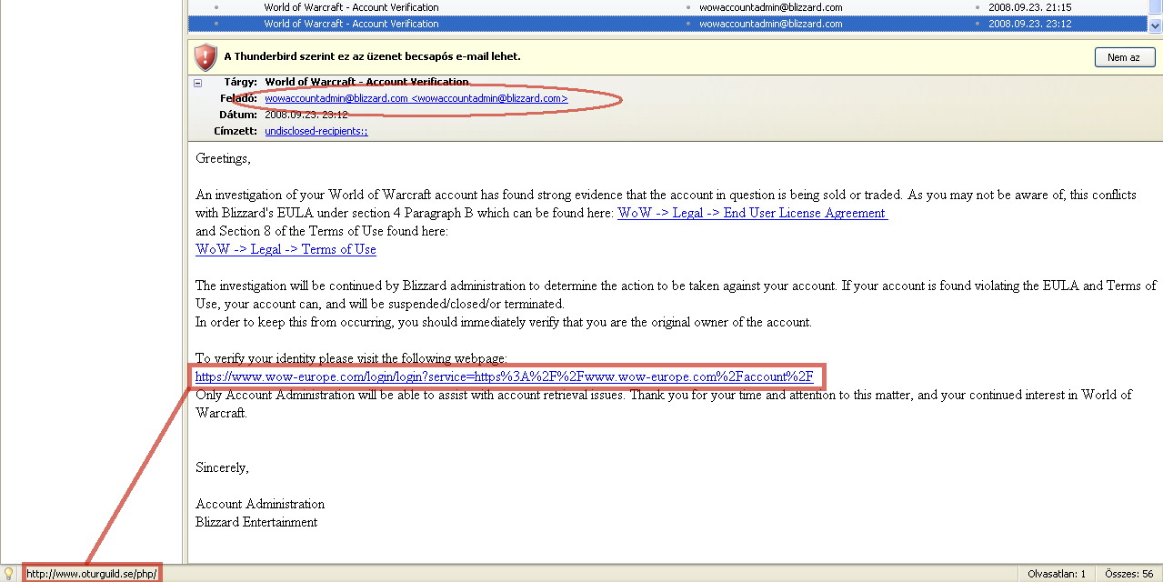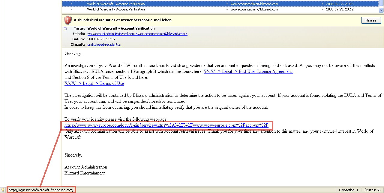Eddig személy szerint úgy álltam hozzá a csaló email-ekhez, hogy 10 millió előfizető közül nagyjából nulla az esély rá, hogy engem szórakoztatnának ilyen ajándékokkal. Három év játékidőm után viszont tegnap én is sorra kerültem. Nem tudom hogyan juthattak hozzá a mail címemhez, azt sem, hogy @blizzard-os email címről hogy küldhettek levelet.